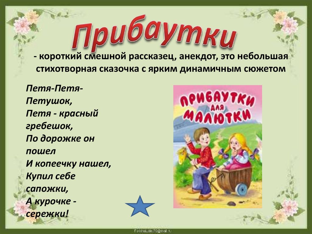 - короткий смешной рассказец, анекдот, это небольшаястихотворная сказочка с ярким динамичным сюжетом