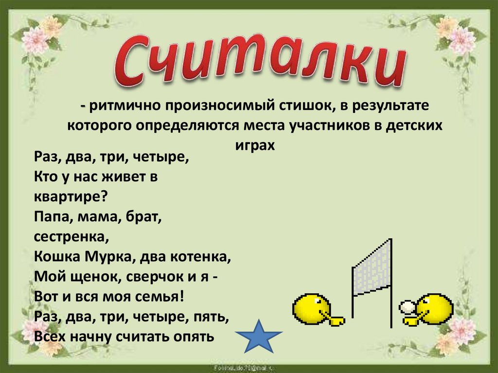 - ритмично произносимый стишок, в результатекоторого определяются места участников в детских