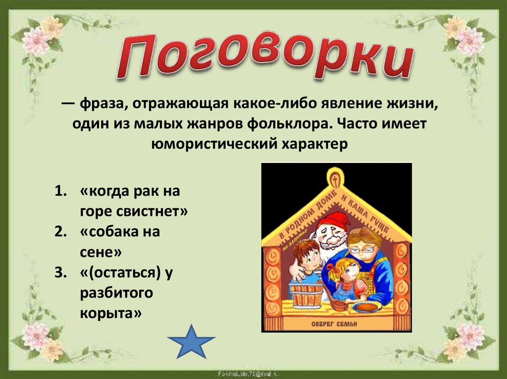 — фраза, отражающая какое-либо явление жизни,один из малых жанров фольклора. Часто имеет