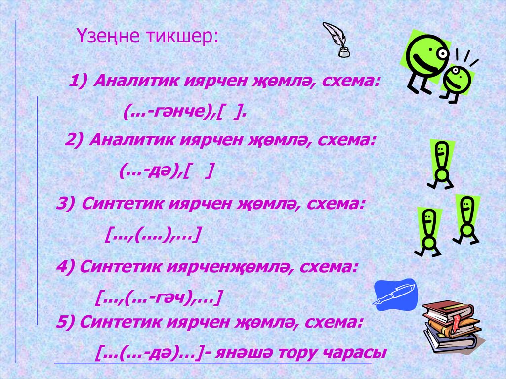 Үзеңне тикшер:1) Аналитик иярчен җөмлә, схема: