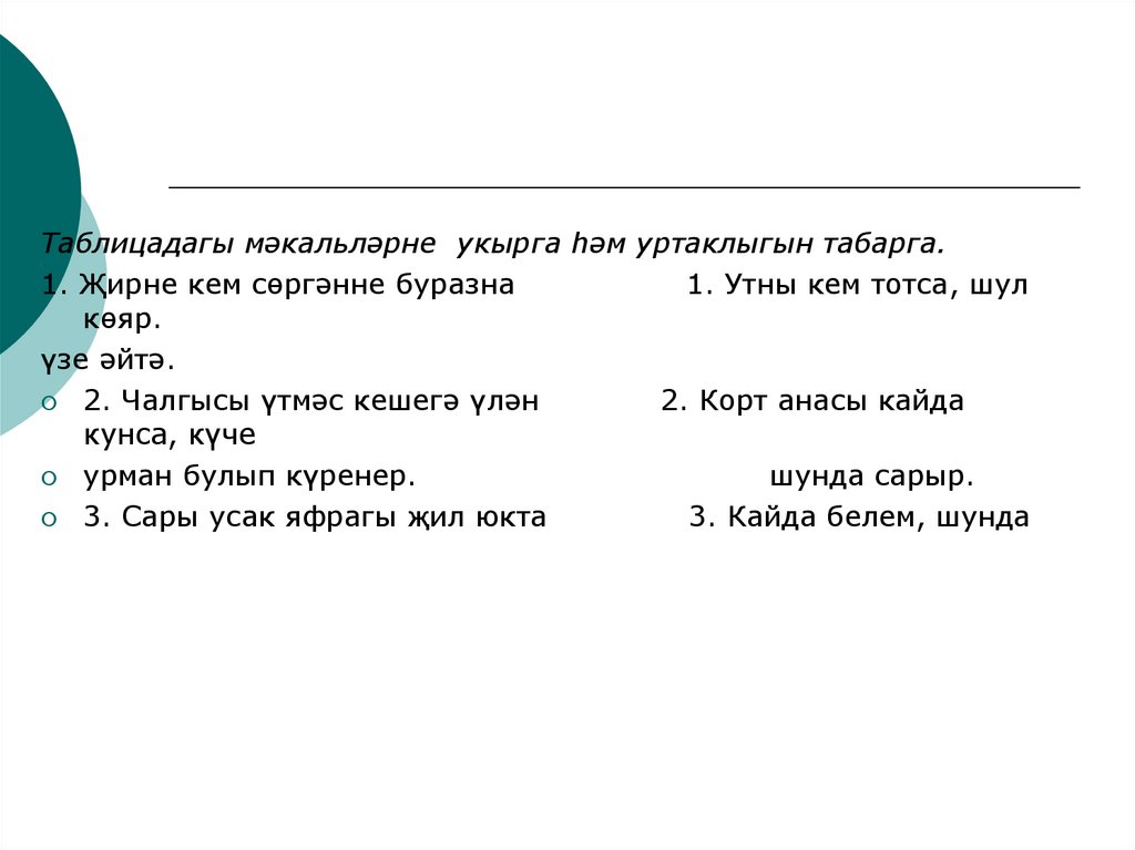 Таблицадагы мәкальләрне укырга һәм уртаклыгын табарга.1. Җирне кем сөргәнне буразна