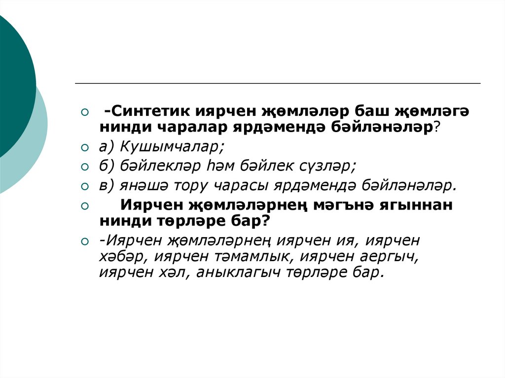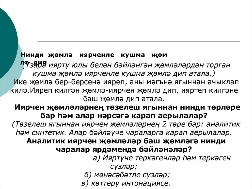 (Тезмә кушма җөмләләр, иярченле кушма җөмләләр.)