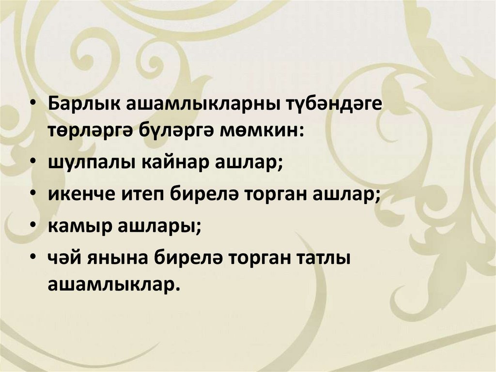 • Барлык ашамлыкларны түбәндәгетөрләргә бүләргә мөмкин: