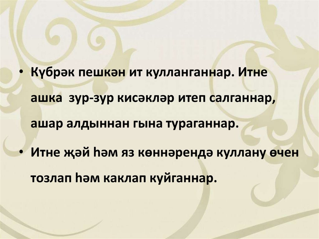 • Күбрәк пешкән ит кулланганнар. Итнеашка зур-зур кисәкләр итеп салганнар,