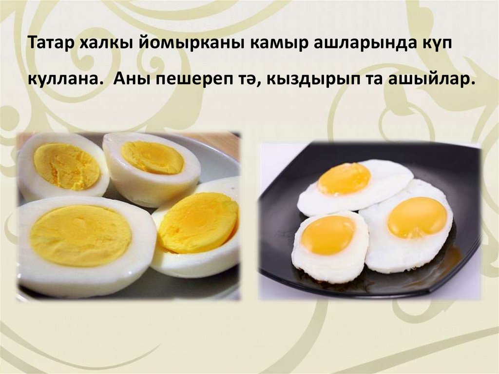 Татар халкы йомырканы камыр ашларында күпкуллана. Аны пешереп тә, кыздырып та ашыйлар.
