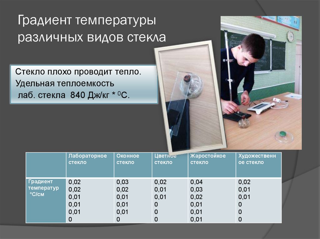 Градиент температурыразличных видов стекла