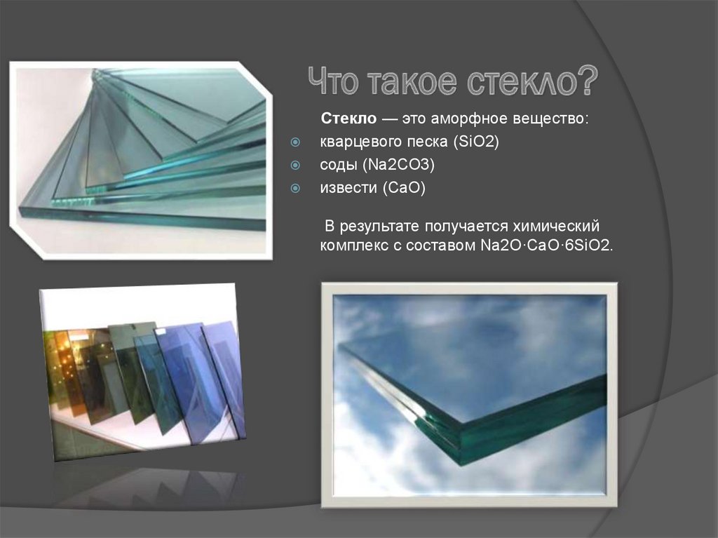 Стекло — это аморфное вещество:кварцевого песка (SiO2)