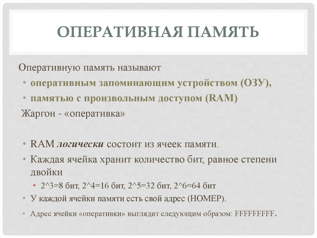 • Адрес ячейки «оперативки» выглядит следующим образом: FFFFFFFFF.