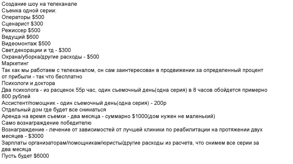 Зарплаты организаторам/помощникам/юристы/другие расходы из расчета, что снимем все серии за