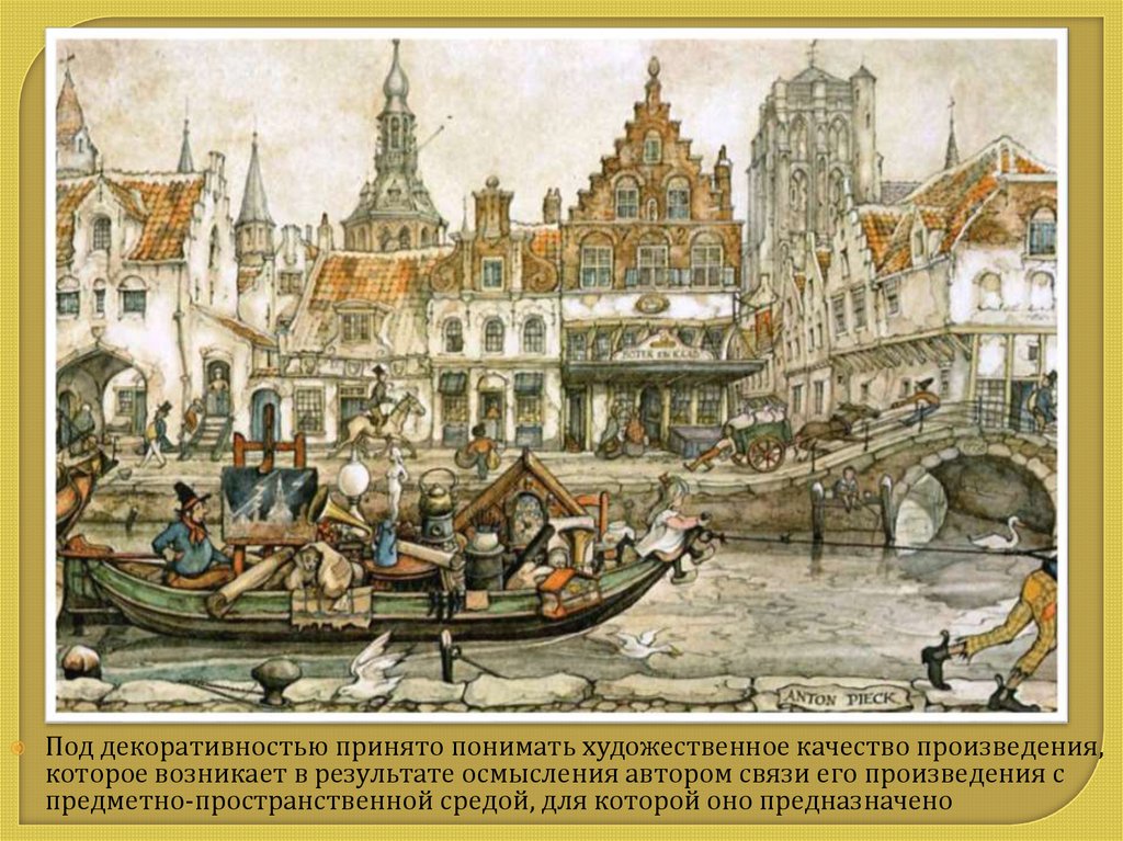 Под декоративностью принято понимать художественное качество произведения,которое возникает в результате осмысления автором связи его произведения с