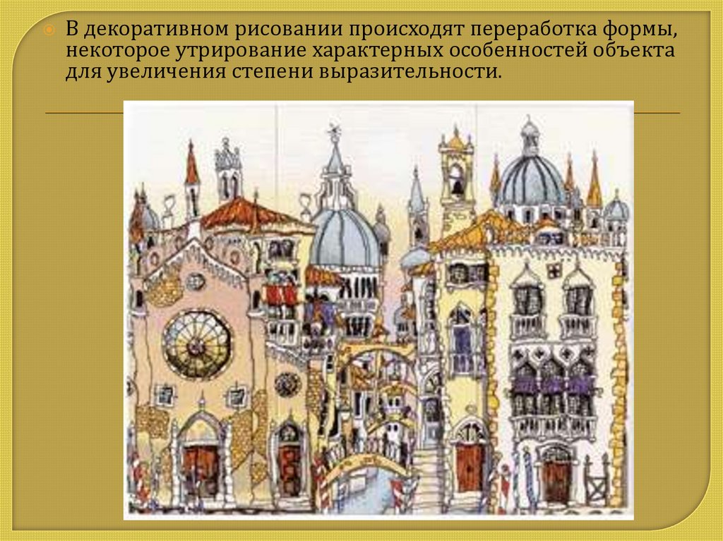 В декоративном рисовании происходят переработка формы,некоторое утрирование характерных особенностей объекта