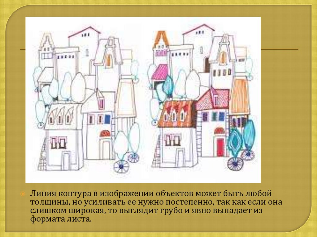 Линия контура в изображении объектов может быть любойтолщины, но усиливать ее нужно постепенно, так как если она