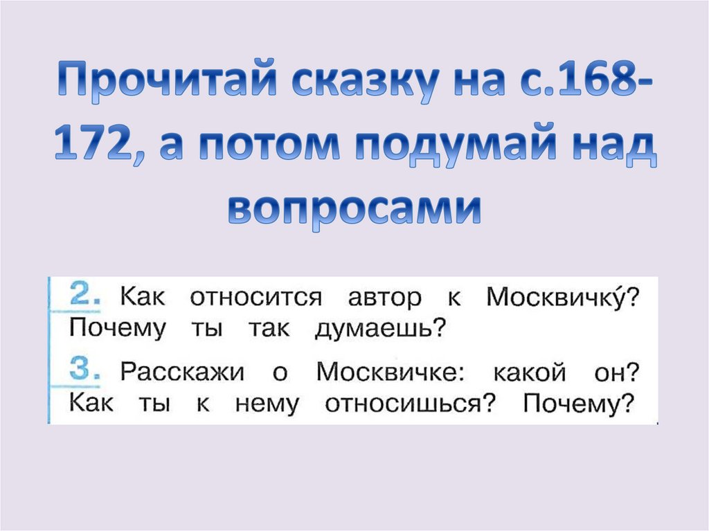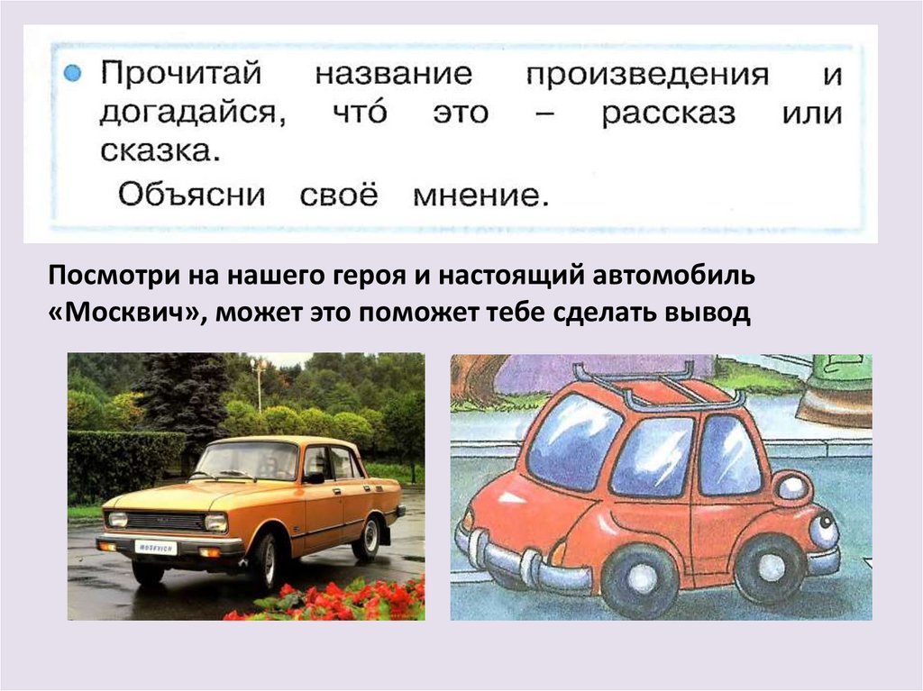 Посмотри на нашего героя и настоящий автомобиль«Москвич», может это поможет тебе сделать вывод