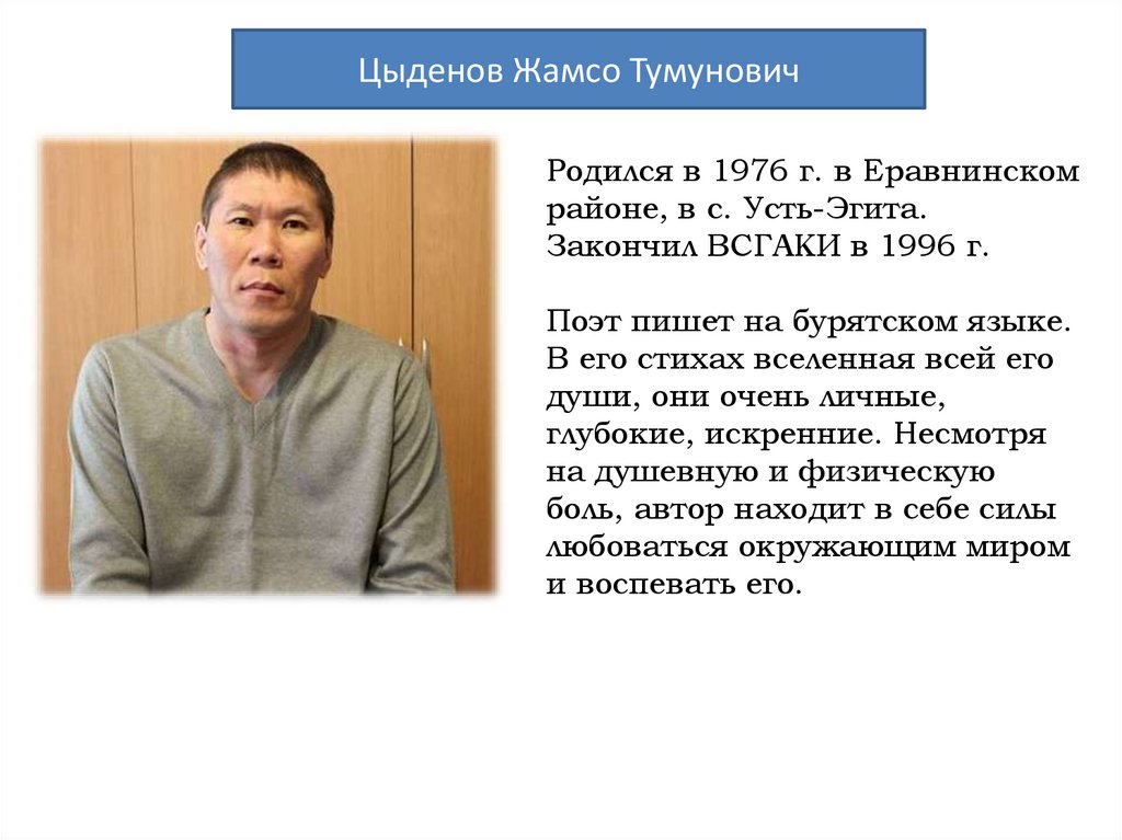 Цыденов Жамсо ТумуновичРодился в 1976 г. в Еравнинском