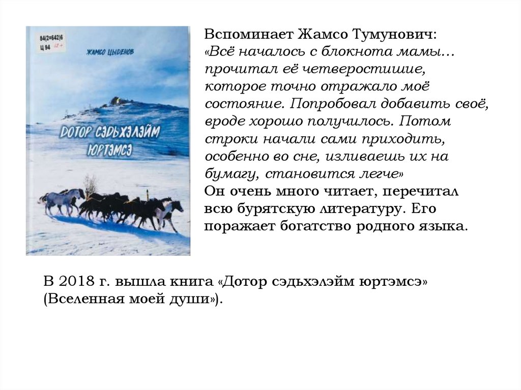 В 2018 г. вышла книга «Дотор сэдьхэлэйм юртэмсэ»