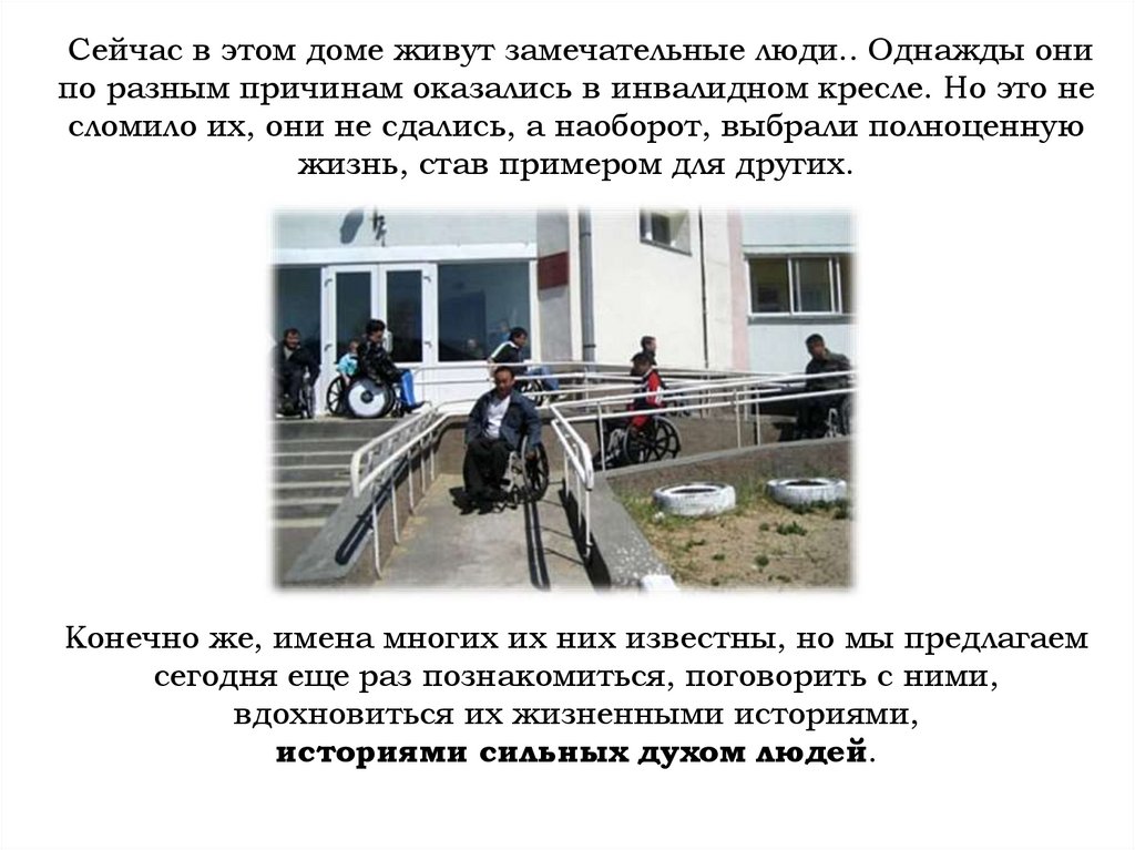 Сейчас в этом доме живут замечательные люди.. Однажды онипо разным причинам оказались в инвалидном кресле. Но это не