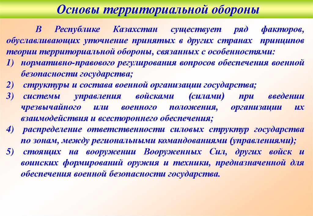 Основы территориальной обороны1. Дать определение территориальной обороне РК.