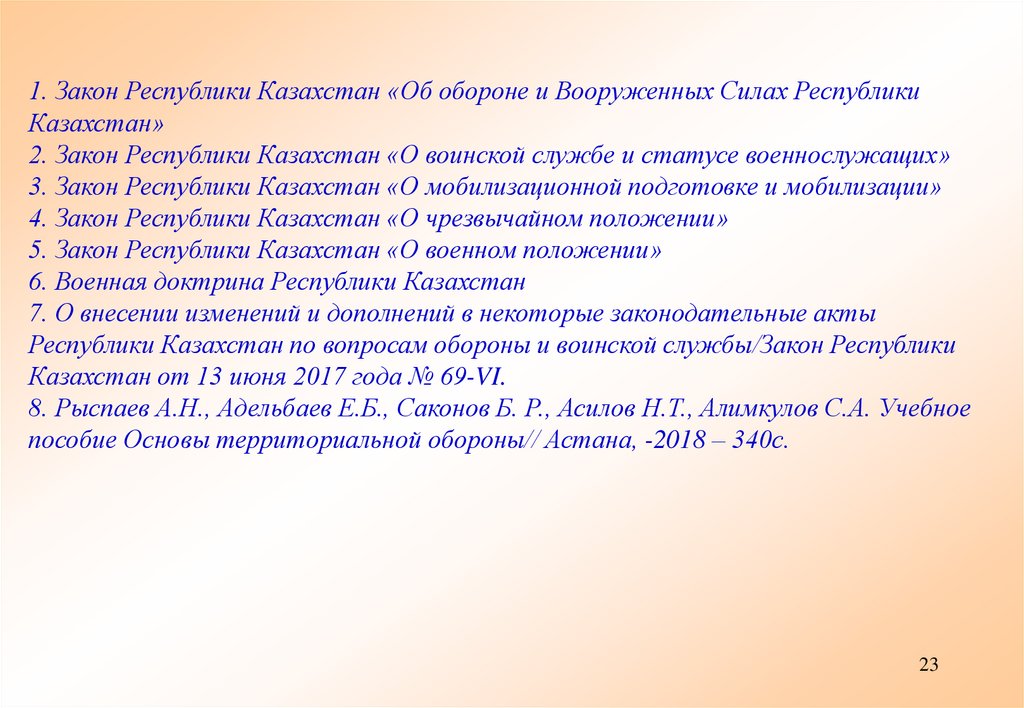 1. Закон Республики Казахстан «Об обороне и Вооруженных Силах РеспубликиКазахстан»