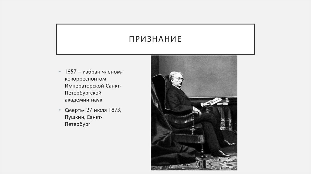 ПРИЗНАНИЕ• 1857 – избран членомкокорреспонтом