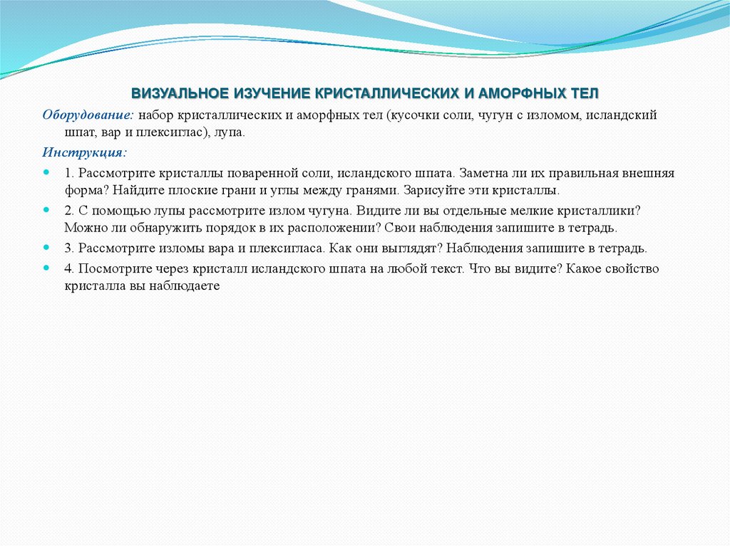 ВИЗУАЛЬНОЕ ИЗУЧЕНИЕ КРИСТАЛЛИЧЕСКИХ И АМОРФНЫХ ТЕЛОборудование: набор кристаллических и аморфных тел (кусочки соли, чугун с изломом, исландский