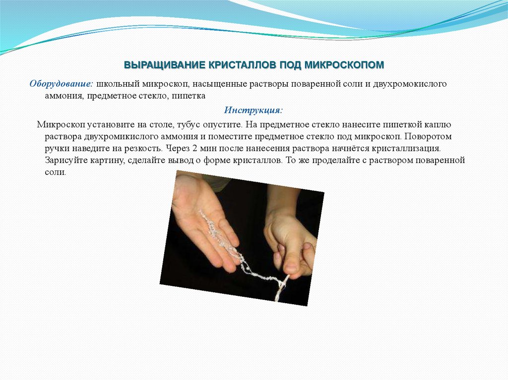 ВЫРАЩИВАНИЕ КРИСТАЛЛОВ ПОД МИКРОСКОПОМОборудование: школьный микроскоп, насыщенные растворы поваренной соли и двухромокислого