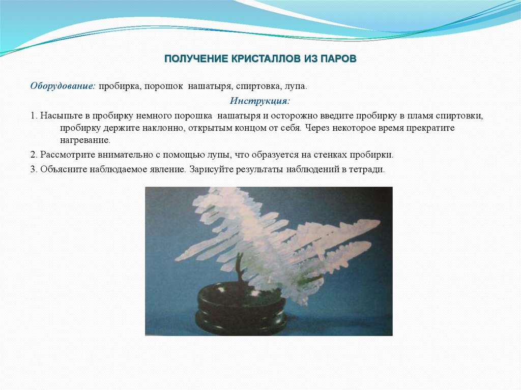 ПОЛУЧЕНИЕ КРИСТАЛЛОВ ИЗ ПАРОВОборудование: пробирка, порошок нашатыря, спиртовка, лупа.