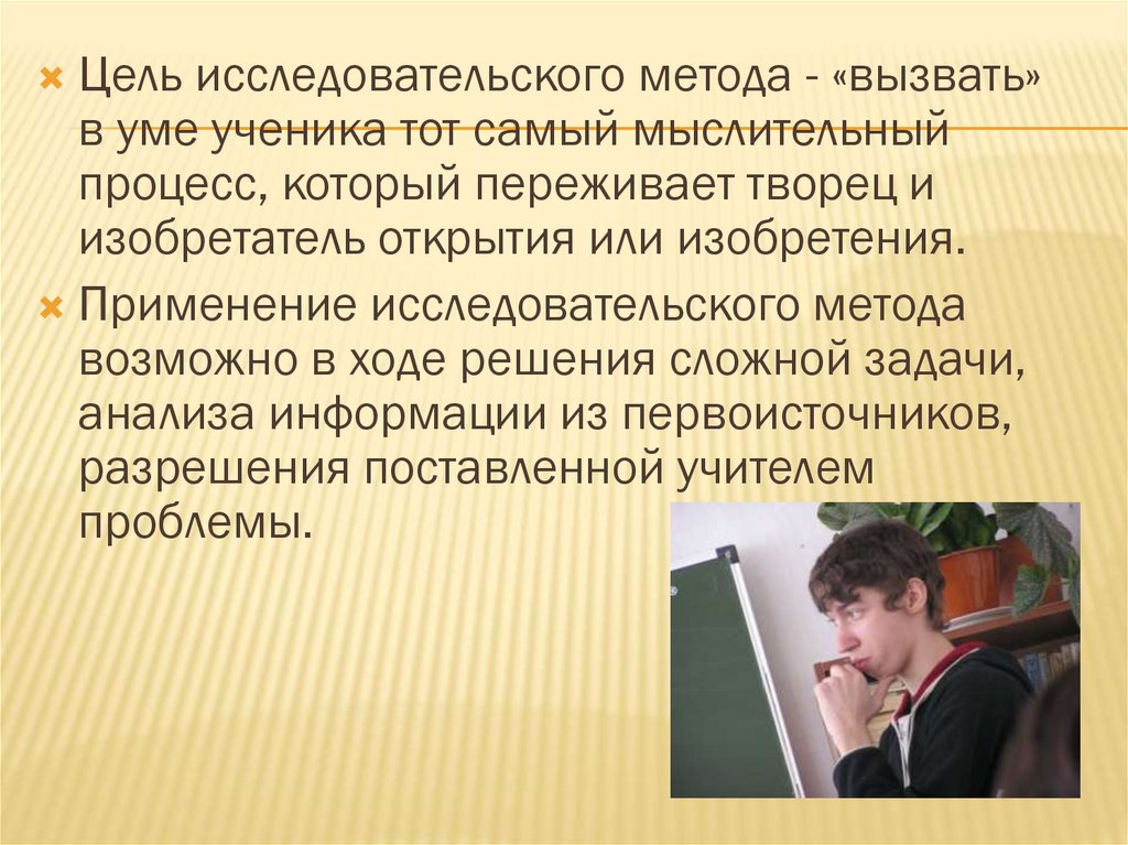 Цель исследовательского метода - «вызвать»в уме ученика тот самый мыслительный