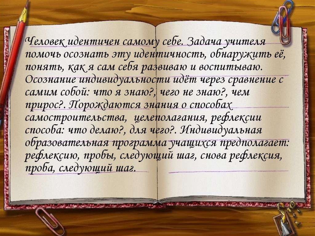 Человек идентичен самому себе. Задача учителяпомочь осознать эту идентичность, обнаружить её,