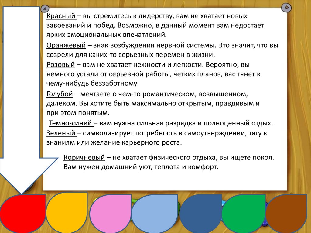 Красный – вы стремитесь к лидерству, вам не хватает новыхзавоеваний и побед. Возможно, в данный момент вам недостает