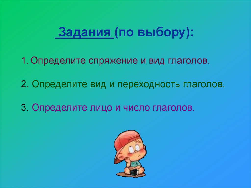 Задания (по выбору):1. Определите спряжение и вид глаголов.