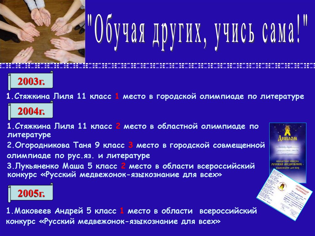 2003г.1.Стяжкина Лиля 11 класс 1 место в городской олимпиаде по литературе