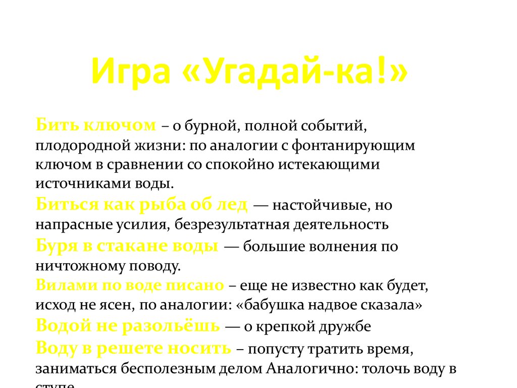 Игра «Угадай-ка!»Бить ключом – о бурной, полной событий,