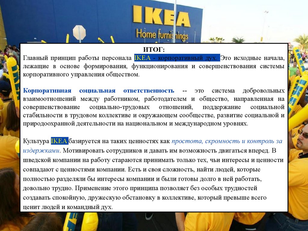 ИТОГ:Главный принцип работы персонала IKEA - корпоративный дух. Это исходные начала,