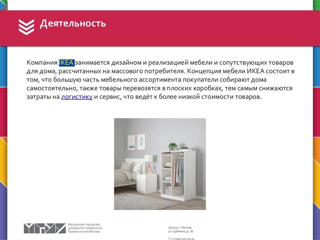 ДеятельностьКомпания IKEA занимается дизайном и реализацией мебели и сопутствующих товаров