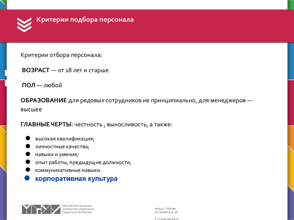 Критерии подбора персоналаКритерии отбора персонала:
