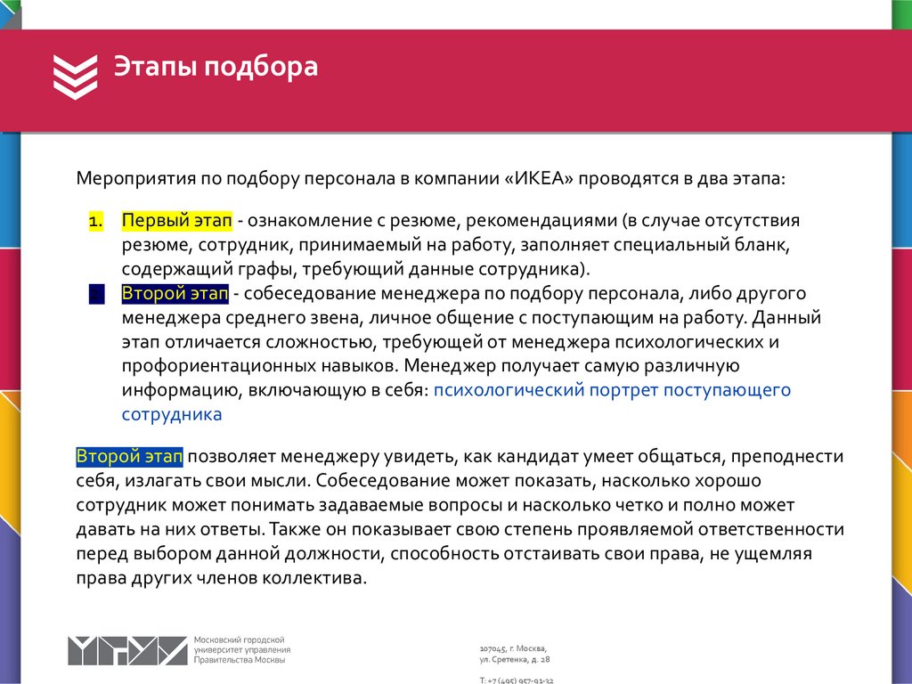 Этапы подбораМероприятия по подбору персонала в компании «ИКЕА» проводятся в два этапа: