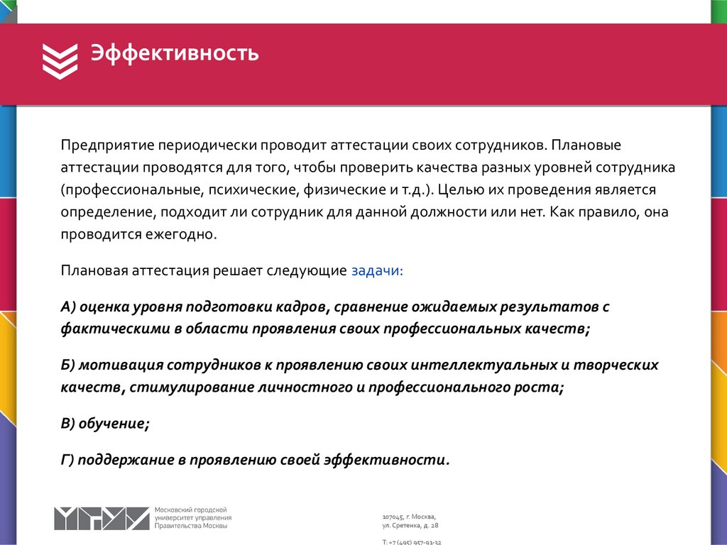 ЭффективностьПредприятие периодически проводит аттестации своих сотрудников. Плановые
