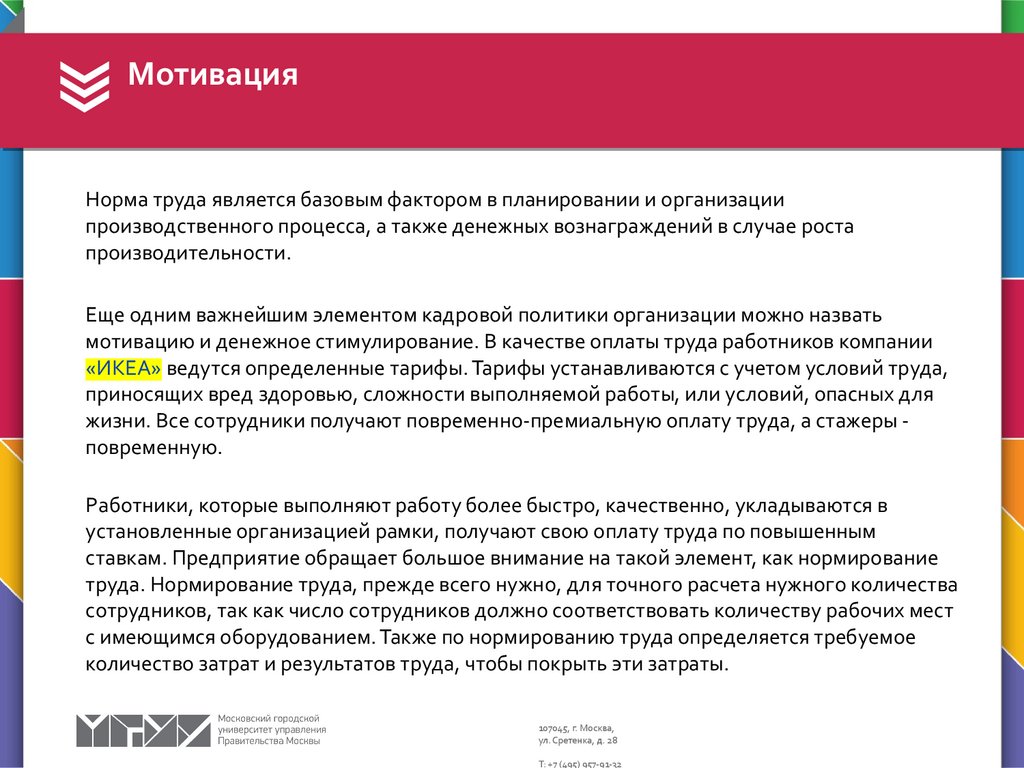 МотивацияНорма труда является базовым фактором в планировании и организации