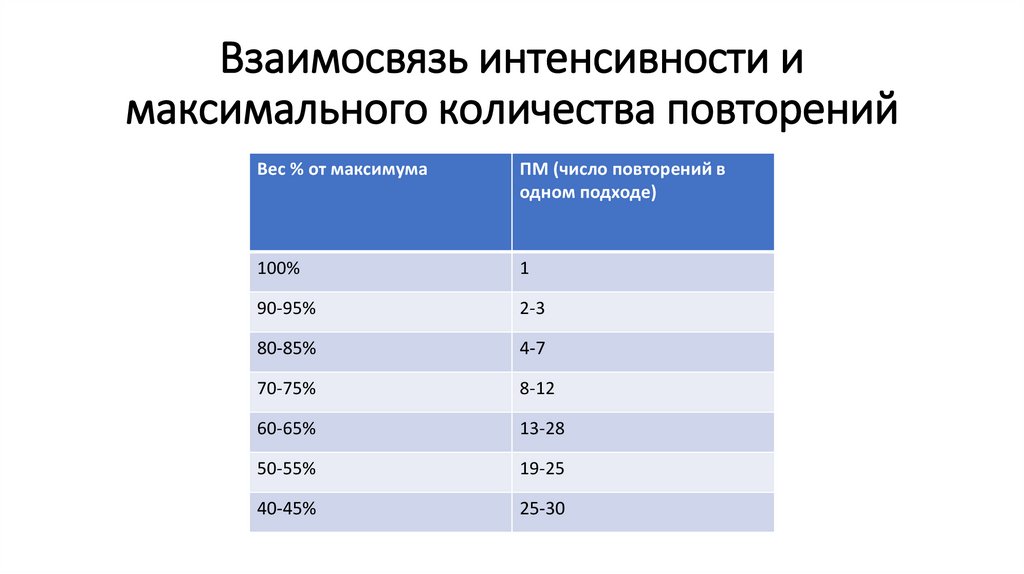 Взаимосвязь интенсивности имаксимального количества повторений