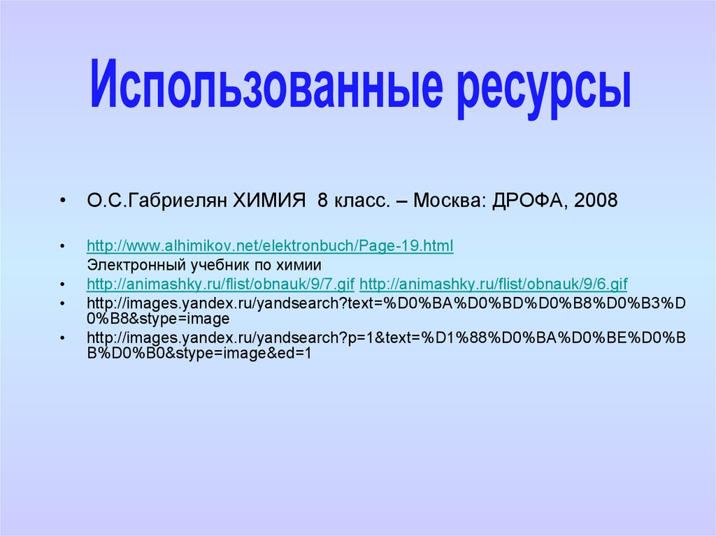 • О.С.Габриелян ХИМИЯ 8 класс. – Москва: ДРОФА, 2008http://www.alhimikov.net/elektronbuch/Page-19.html