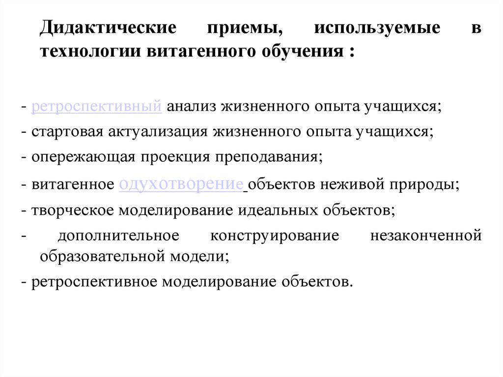 6. Система дидактических приемов на различных этапах технологии витагенного обучения.