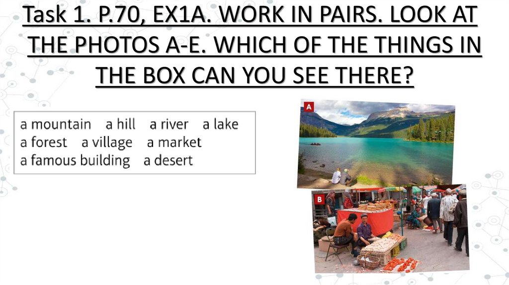 Task 1. P.70, EX1A. WORK IN PAIRS. LOOK ATTHE PHOTOS A-E. WHICH OF THE THINGS IN