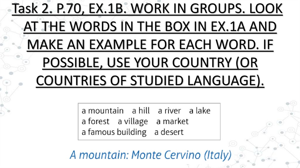 Task 2. P.70, EX.1B. WORK IN GROUPS. LOOKAT THE WORDS IN THE BOX IN EX.1A AND