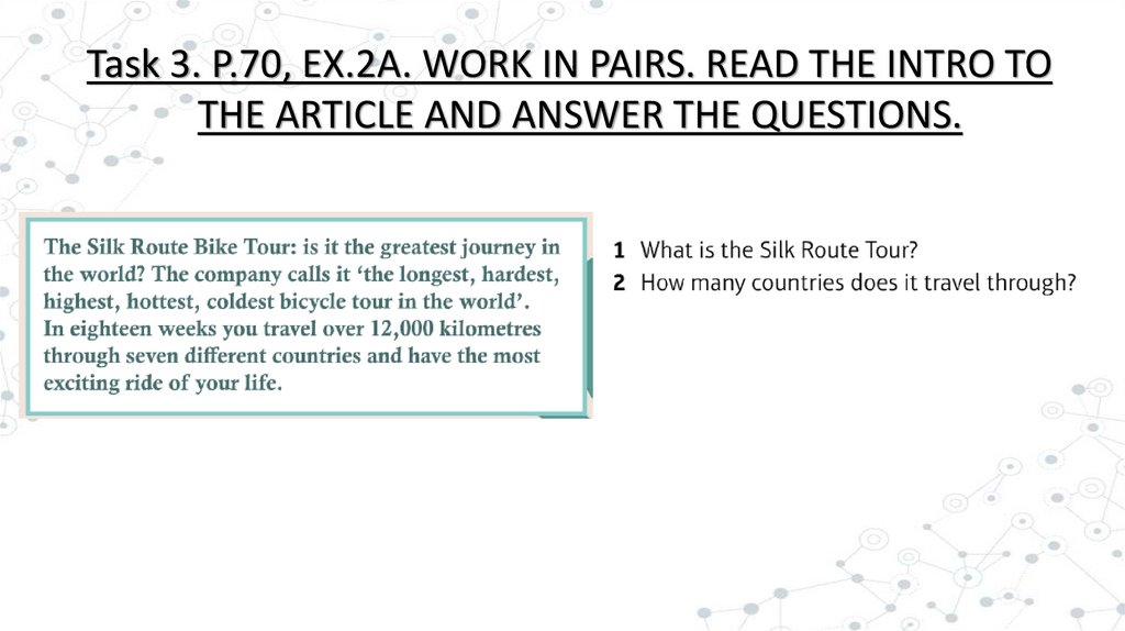 Task 3. P.70, EX.2A. WORK IN PAIRS. READ THE INTRO TOTHE ARTICLE AND ANSWER THE QUESTIONS.