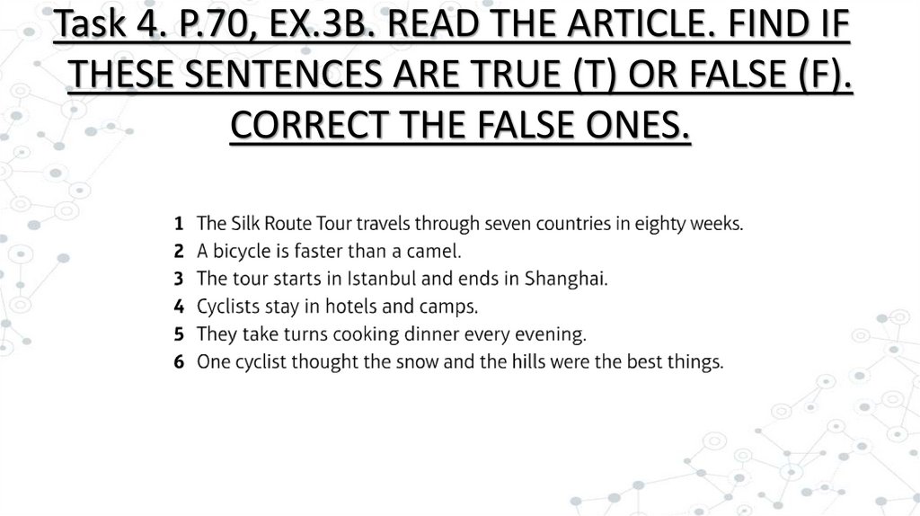 Task 4. P.70, EX.3B. READ THE ARTICLE. FIND IFTHESE SENTENCES ARE TRUE (T) OR FALSE (F).