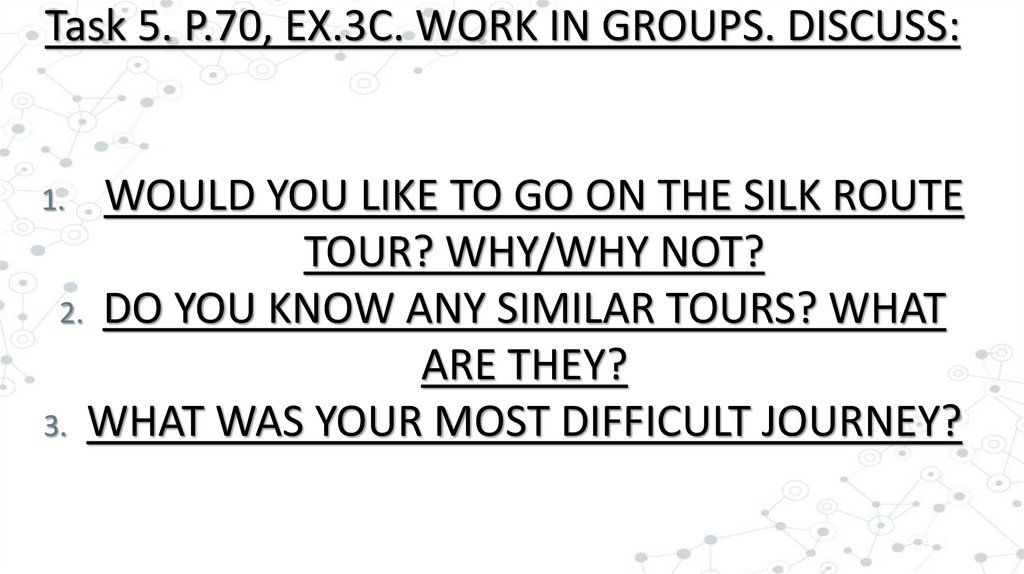 Task 5. P.70, EX.3C. WORK IN GROUPS. DISCUSS:WOULD YOU LIKE TO GO ON THE SILK ROUTE