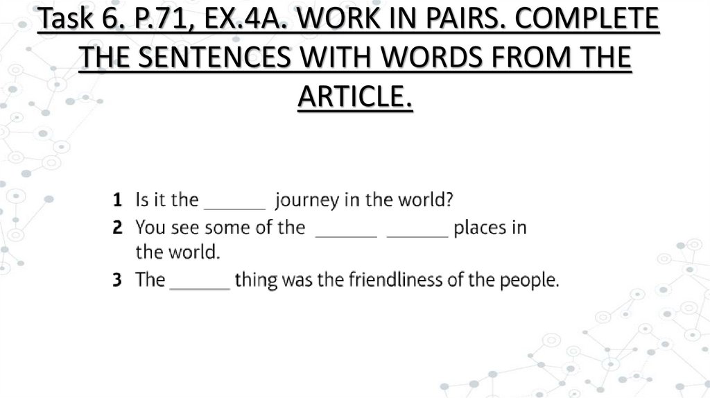 Task 6. P.71, EX.4A. WORK IN PAIRS. COMPLETETHE SENTENCES WITH WORDS FROM THE