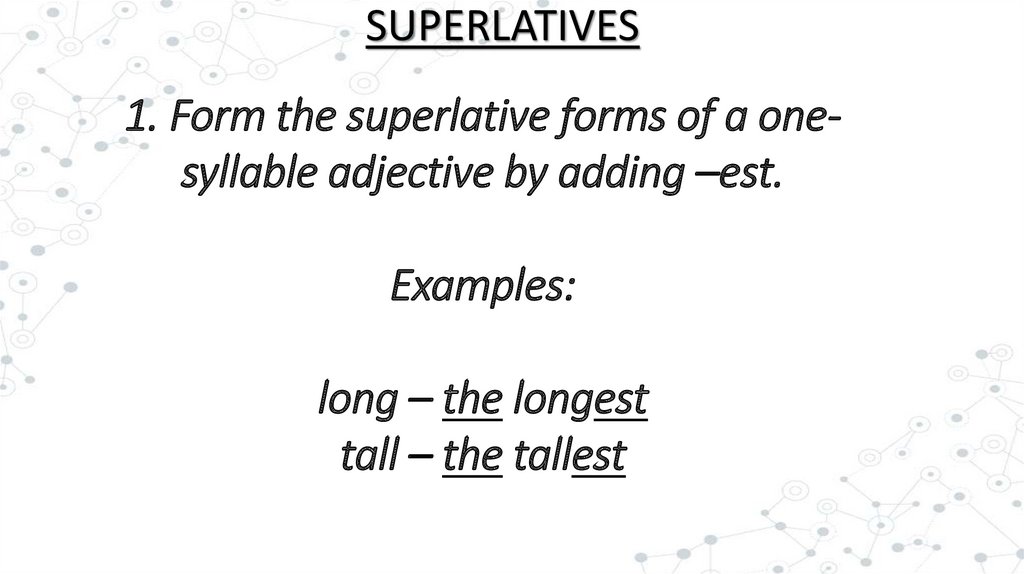 SUPERLATIVES1. Form the superlative forms of a onesyllable adjective by adding –est.