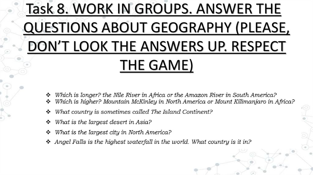 Task 8. WORK IN GROUPS. ANSWER THEQUESTIONS ABOUT GEOGRAPHY (PLEASE,