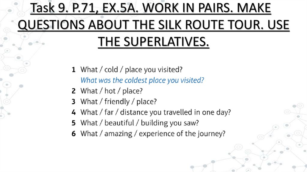 Task 9. P.71, EX.5A. WORK IN PAIRS. MAKEQUESTIONS ABOUT THE SILK ROUTE TOUR. USE